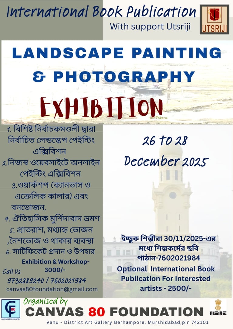The Canvas 80 Foundation proudly presents the International Online Landscape Painting & Photography Exhibition 2025, to be held from 26th December to 31st December 2025. Directed by Mr. Abhishek Acharyya and coordinated by Mrs. Sumona Adhikari, this exhibition offers a global platform for artists and photographers to showcase their creativity and vision. The event invites submissions capturing the beauty of nature, landscapes, and human connection with the environment. Selected works will be featured both online and at the Canvas 80 Foundation Gallery, providing national and international exposure to talented creators. An entry fee is applicable for participation, covering exhibition management, curation, and certificate distribution. All participants will receive an official Certificate of Participation, and outstanding entries may be featured in future international art publications. Artists are requested to submit their paintings and photography images before the deadline. Additional images will be curated for permanent display in the Foundation’s online gallery.